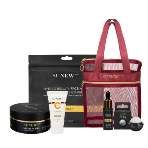 Efekt glass skin & anti-aging. Zestaw sprawia, że skóra staje się gładka, napięta i gotowa na każde wyjście. Nocne płatki i aktywator redukują zmarszczki pod oczami. Maska Essence+ intensywnie nawilża i koi skórę, także po ekspozycji na słońce. Lekki krem wyrównuje koloryt skóry i regeneruje. Zestaw zapakowany jest w dużą, elegancką bordową kosmetyczce.